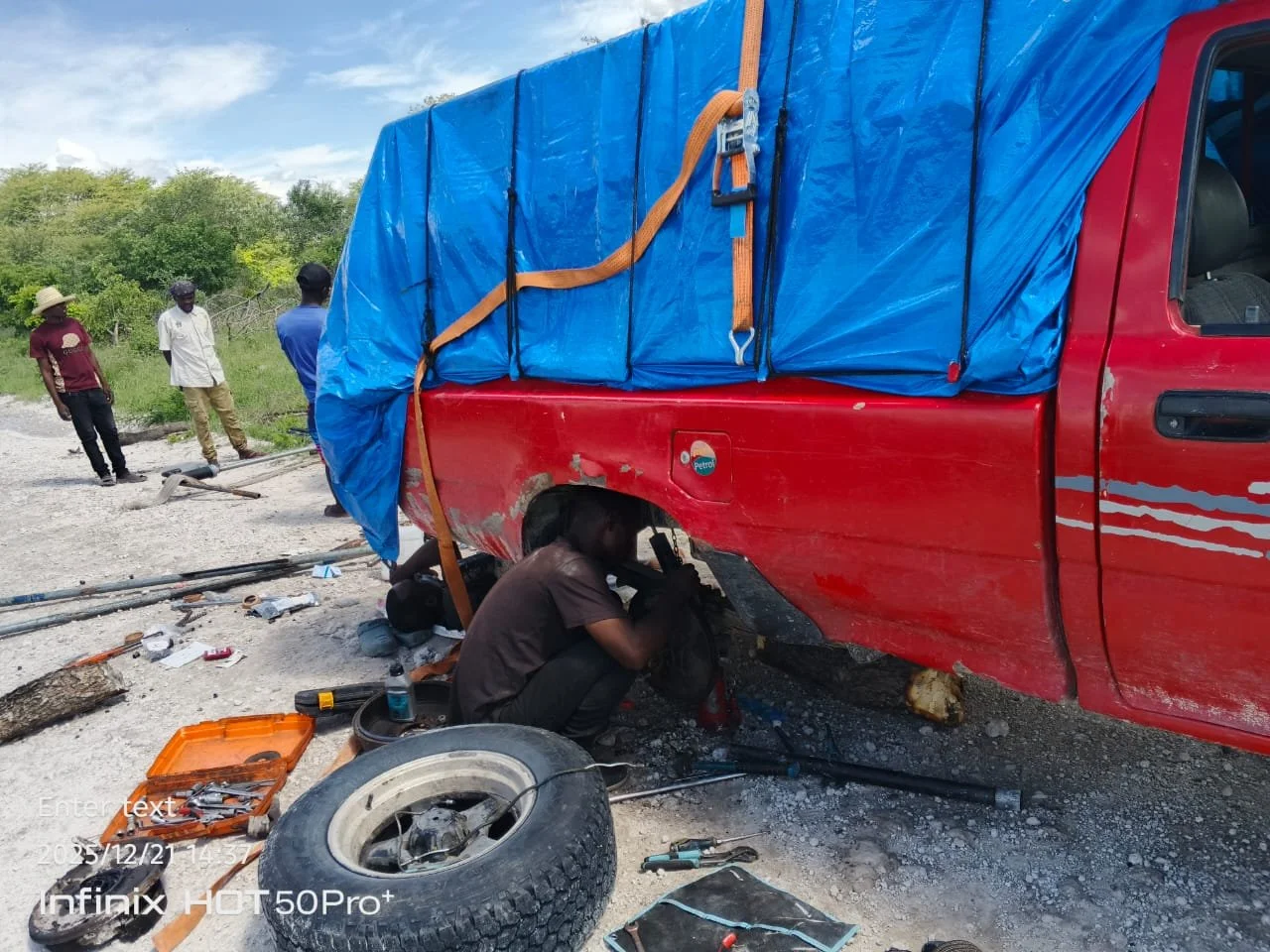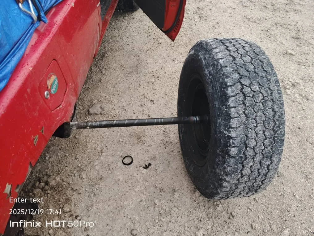 We have all heard the idiom “the wheels falling off”, as a metaphoric of a sudden demise. When our forman John Simasiku called on December 19 and said “the wheels are falling off” he was not metaphorically speaking, the “wheel” (or more accurately the right rear axle) parted company with the differential on the K6 Toyota Hilux.
